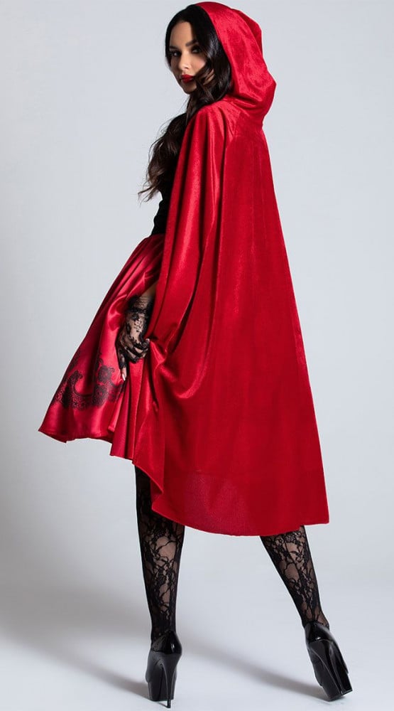 - طقم لبس ذات الرداء الاحمر تنكري مكون من قطعتين: فستان قصير ورداء أحمر طويل بغطاء للرأس.