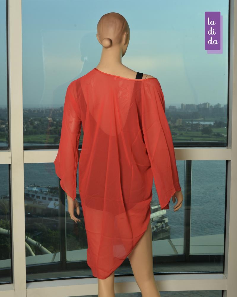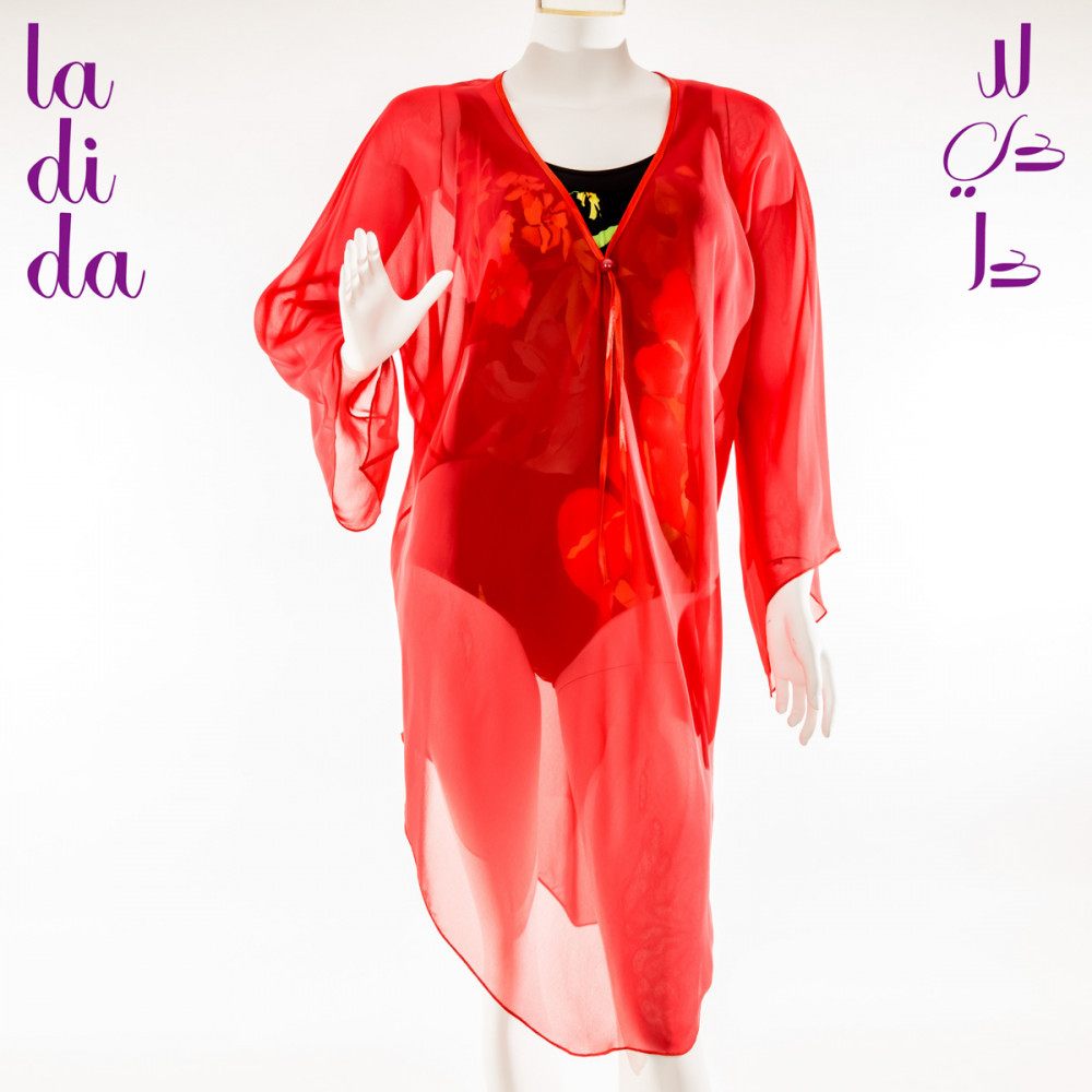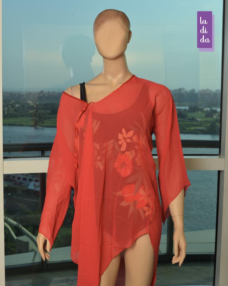 المايوه يأتي بقصّة كلاسيكية بحمالات عريضة وصدر مفتوح ودائري، مع كاش مايوه باللون الأحمر بخامة شيفون شفافة وخفيفة سريعة الجفاف.