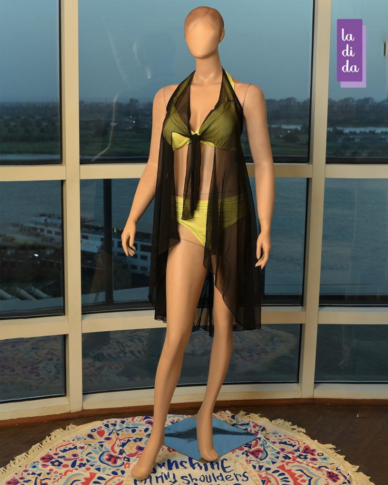يأتي مع المايوه كاش مايوه باللون الأسود بحمالات تُعلق على الرقبة أيضًا، ولكن ما يميزه أنه يُمكن ربطه من الصدر على شكل فيونكة لإضفاء لمسة أنثوية ورقيقة على إطلالتك.